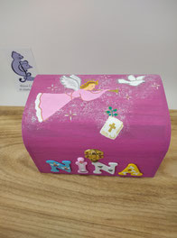 Pour chacun des modèles: Les lettres du prénom sont décorées avec des motifs selon le thème choisi. Les côtés droit et gauche du coffret sont décorés selon les informations renseignées. Les contenants sont en option, à commander séparément.